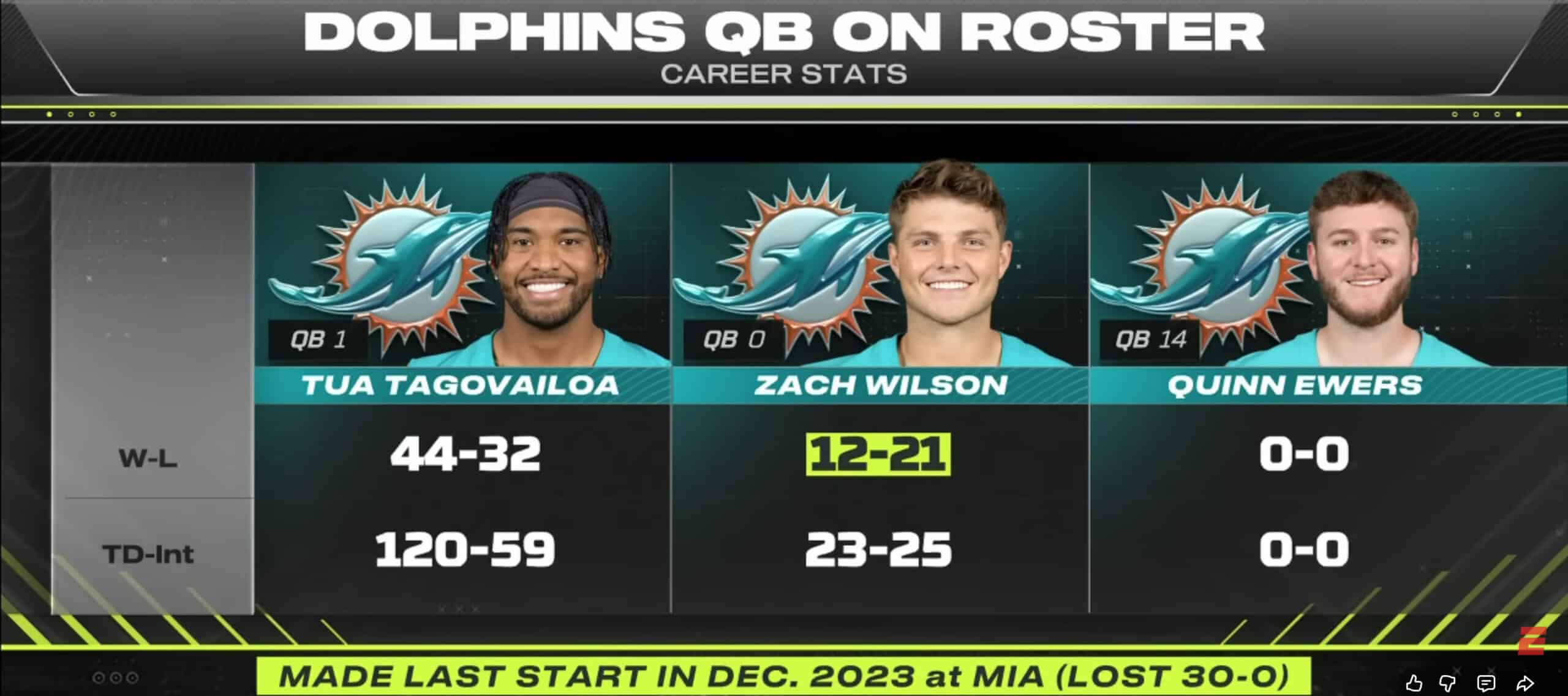 The first is Zach Wilson, formerly of the Jets, a first-round pick from the 2021 NFL Draft who lost his starting role after three seasons. Wilson has seen the field in three games for the Dolphins this season, completing six of nine attempts.
